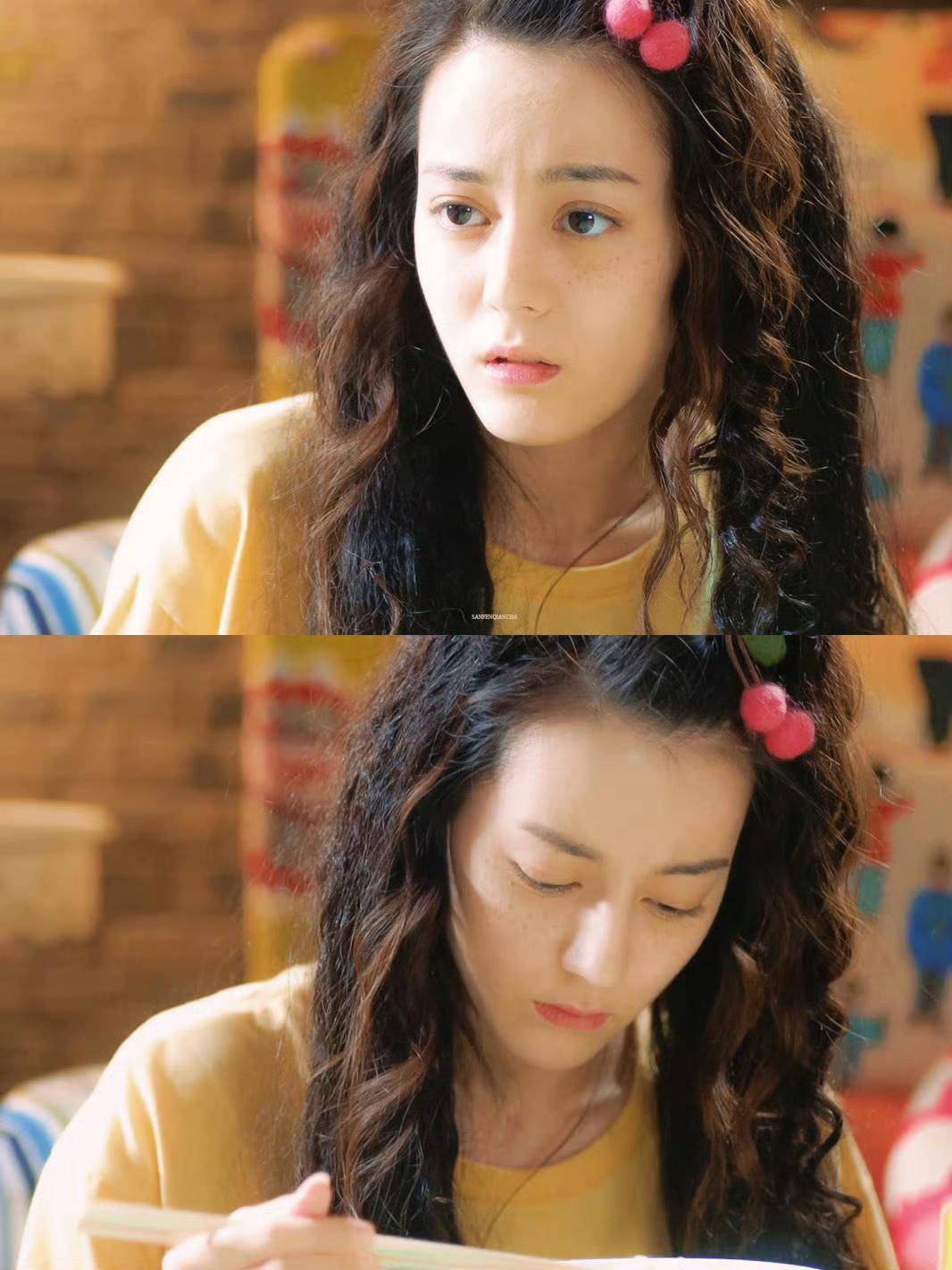 迪丽热巴短发路透,眼神忧郁带雀斑,高鼻梁似假小子